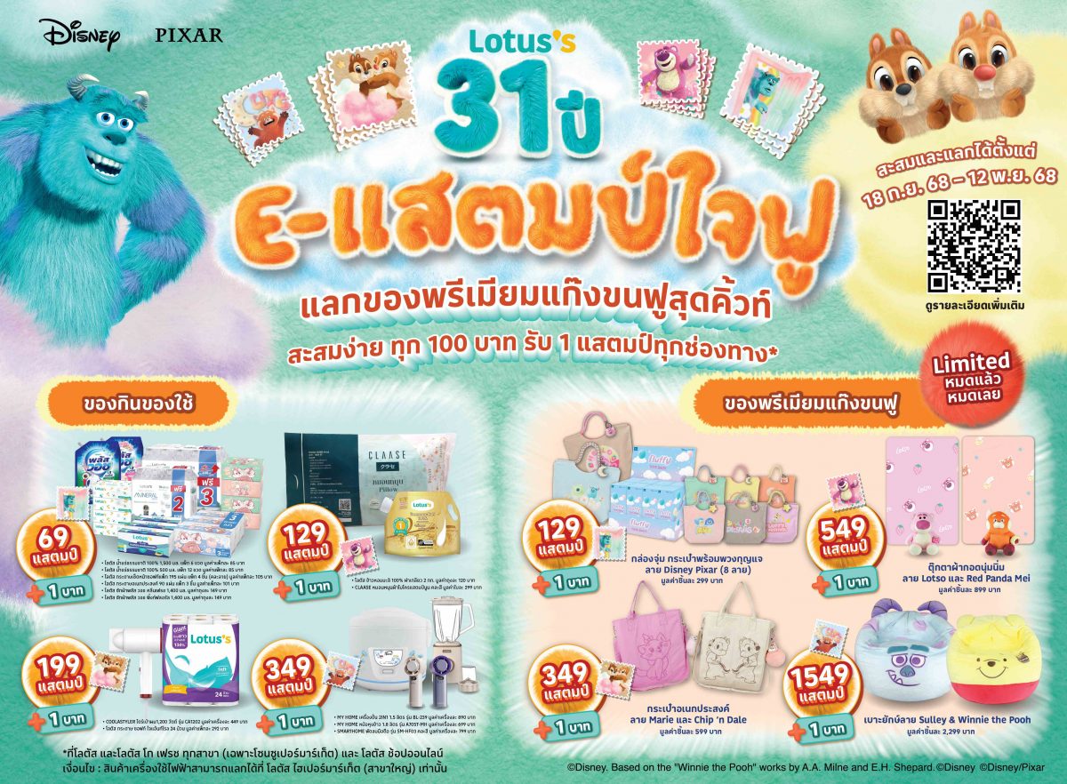นอกเหนือจากโปรโมชันพิเศษและของพรีเมียมสุดน่ารัก ลูกค้ายังสามารถเป็นเจ้าของสินค้าลิขสิทธิ์ลวดลายดิสนีย์สุดเอ็กซ์คลูซีฟ ที่มีวางจำหน่ายเฉพาะที่โลตัสเท่านั้น โดยในคอลเลกชั่นพิเศษนี้ประกอบด้วยสินค้ากว่า 80 รายการ ที่รังสรรค์ขึ้นภายใต้การเฉลิมฉลองครบรอบ 31 ปี พร้อมให้ลูกค้าทุกเจเนอเรชั่นเลือกจับจองได้ตั้งแต่วันที่ 18 กันยายน ถึง 12 พฤศจิกายน 2568