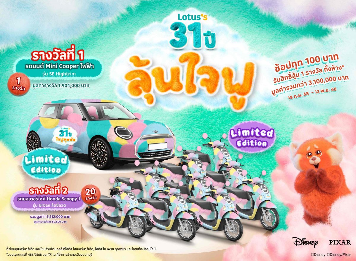 กรุงเทพฯ 18 กันยายน 2568 – โลตัส ผู้นำธุรกิจค้าปลีก ภายใต้บริษัท ซีพี แอ็กซ์ตร้า จำกัด (มหาชน) ที่อยู่เคียงข้างสังคมไทยมายาวนาน เดินหน้าสร้างปรากฎการณ์ครั้งใหญ่ในโอกาสครบรอบ 31 ปี เปิดตัวแคมเปญ “โลตัส 31 ปี ใจฟูทุกวัน” โดยครั้งนี้ร่วมมือกับ “ดิสนีย์ ประเทศไทย” พาเหล่าคาแรกเตอร์ขนฟู จากดิสนีย์ และดิสนีย์ พิกซาร์ ที่ทุกคนหลงรักมาสร้างรอยยิ้มและเติมเต็มความสุขให้กับลูกค้าทุกคน พร้อมทั้งร่วมมือกับพันธมิตรแบรนด์ดังกว่า 70 แบรนด์ มอบโปรโมชันดีๆ ที่จะทำให้คนไทย “ใจฟู” ตลอดทั้งแคมเปญ ตั้งแต่วันที่ 18 กันยายน 2568 – 12 พฤศจิกายน 2568