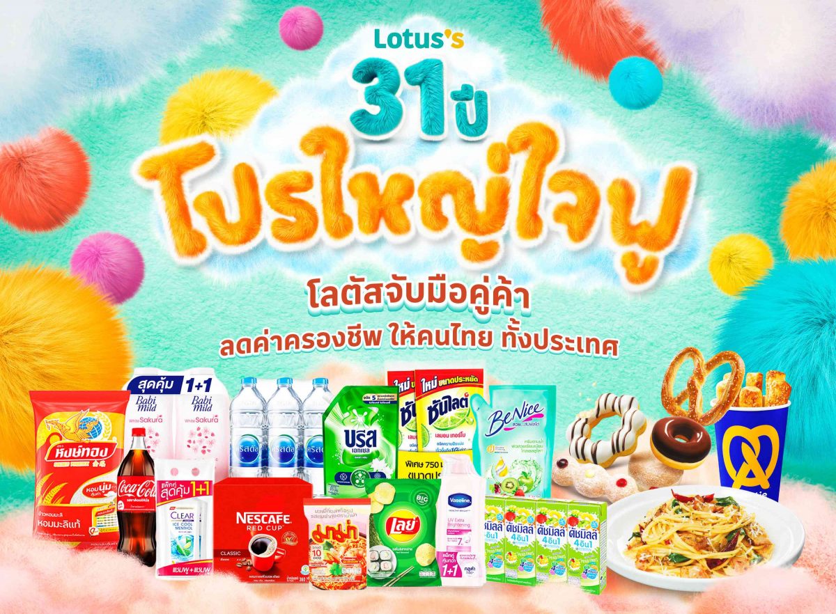 โลตัสจับมือพันธมิตรแบรนด์ชั้นนำกว่า 70 แบรนด์ดังชั้นนำ จัดโปรโมชันแรงแห่งปี มอบความคุ้มค่าและช่วยลดค่าครองชีพให้กับคนไทย เพื่อแทนคำขอบคุณที่ลูกค้าสนับสนุนโลตัสมาตลอด 31 ปี