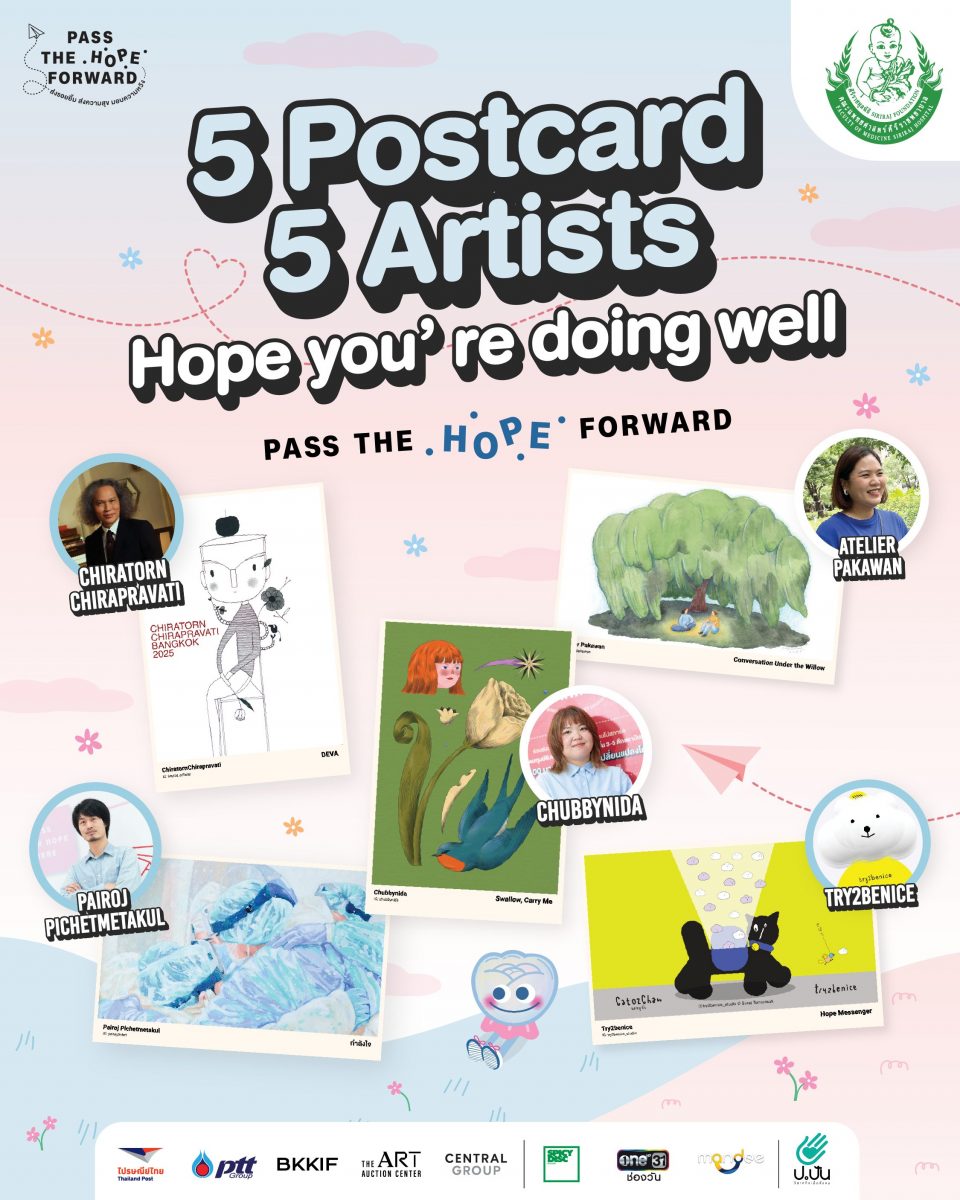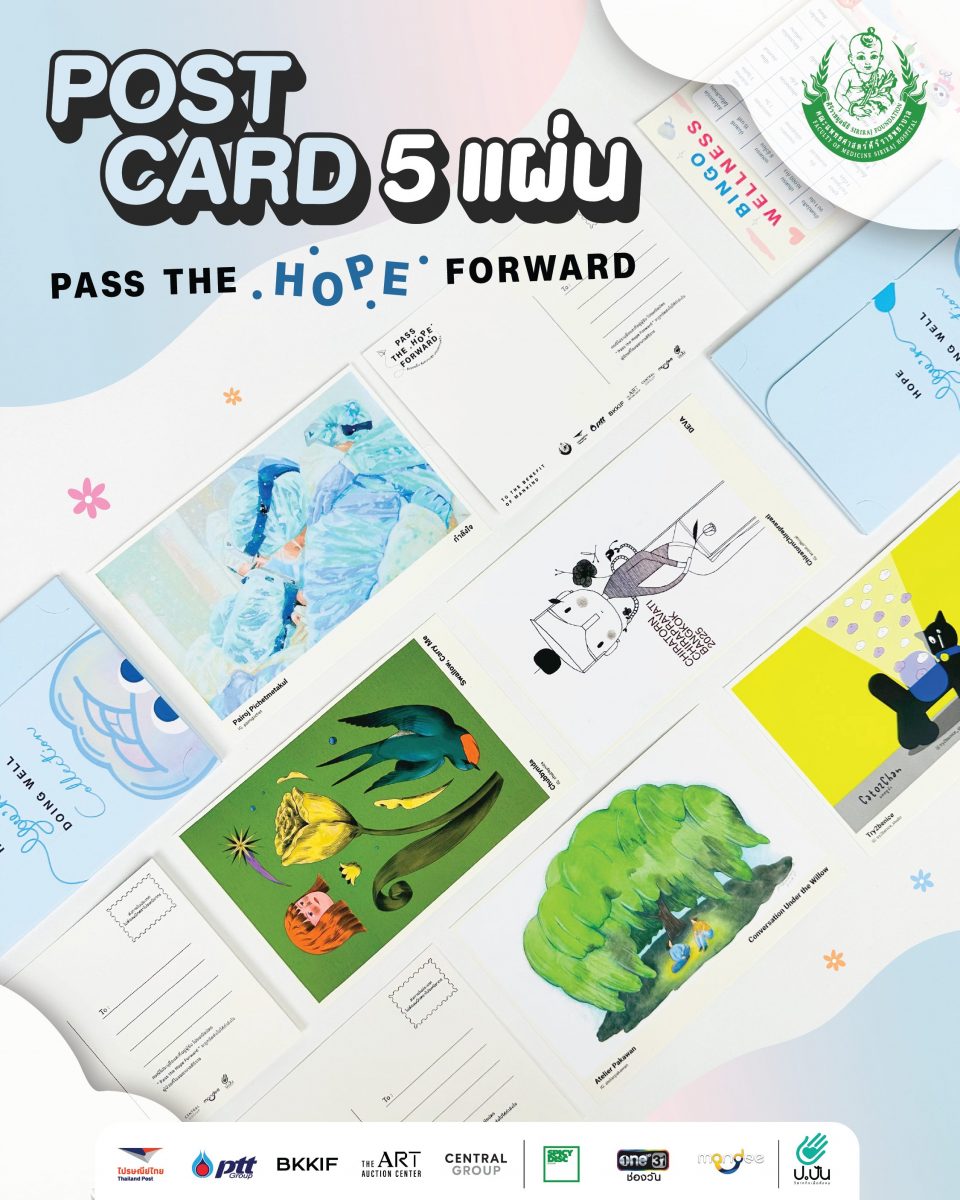 โครงการ ‘Pass the Hope Forward’ ส่งรอยยิ้ม ส่งความสุข มอบความหวัง โดย ศิริราชมูลนิธิ, บอย โกสิยพงษ์, ไปรษณีย์ไทย และ ป.ปัน วิสาหกิจเพื่อสังคม ร่วมกับ Bangkok Illustrator Fair (BKKIF) ชวน 20 ศิลปินไทยจิตอาสา มาร่วมออกแบบโปสการ์ดสุดพิเศษจำนวน 20 แบบ ล่าสุดกับการเปิดตัว “Postcard Set 3 – Hope You’re Doing Well” ในช่วงเดือนสิงหาคม 2568 จาก 5 ศิลปินชื่อดัง นำโดย ‘ครูโต’ ม.ล.จิราธร จิรประวัติ, ป๊อก-ไพโรจน์ พิเชฐเมธากุล, อาท-สุรัติ โตมรศักดิ์ หรือ Try2benice , นิดา หรือ Chubbynida และ ภควรรณ ทองวานิช หรือ Atelier Pakawan โดยใน Set 3 นี้ เปิดตัวมาพร้อมกับ ‘น้องมะลิ’ ที่เปรียบเสมือนตัวแทนของความห่วงใย และความอ่อนโยน และ Special Card “Bingo Wellness” เป็นกิจกรรมเพื่อส่งเสริมสุขภาพและความเป็นอยู่ที่ดี และหวังว่าทุกคนที่ได้รับโปสการ์ดเซ็ตนี้จะรู้สึกถึงความปรารถนาดีเล็ก ๆ จากใครสักคนที่อยากบอกว่า ‘ขอให้เธอสบายดีนะ’ คำทักทายง่าย ๆ ที่อาจเปลี่ยนวันที่เหนื่อยล้า ให้กลับมามีความหวังอีกครั้ง ผ่านแนวคิดของ 5 ศิลปิน