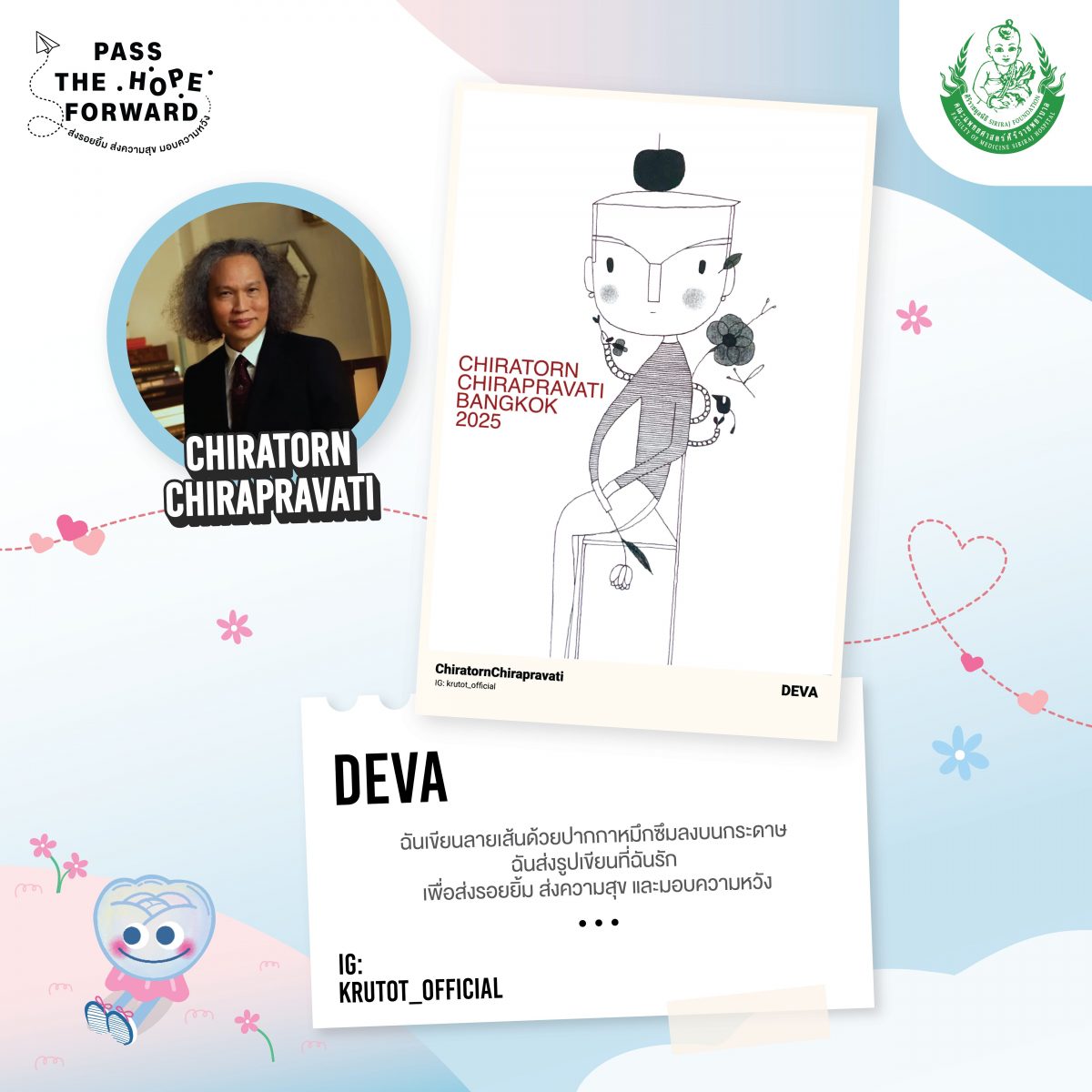 ● ‘ครูโต’ ม.ล.จิราธร จิรประวัติ: DEVA ฉันเขียนลายเส้นด้วยปากกาหมึกซึมลงบนกระดาษ ฉันส่งรูปเขียนที่ฉันรัก เพื่อส่งรอยยิ้ม ส่งความสุข และมอบความหวัง