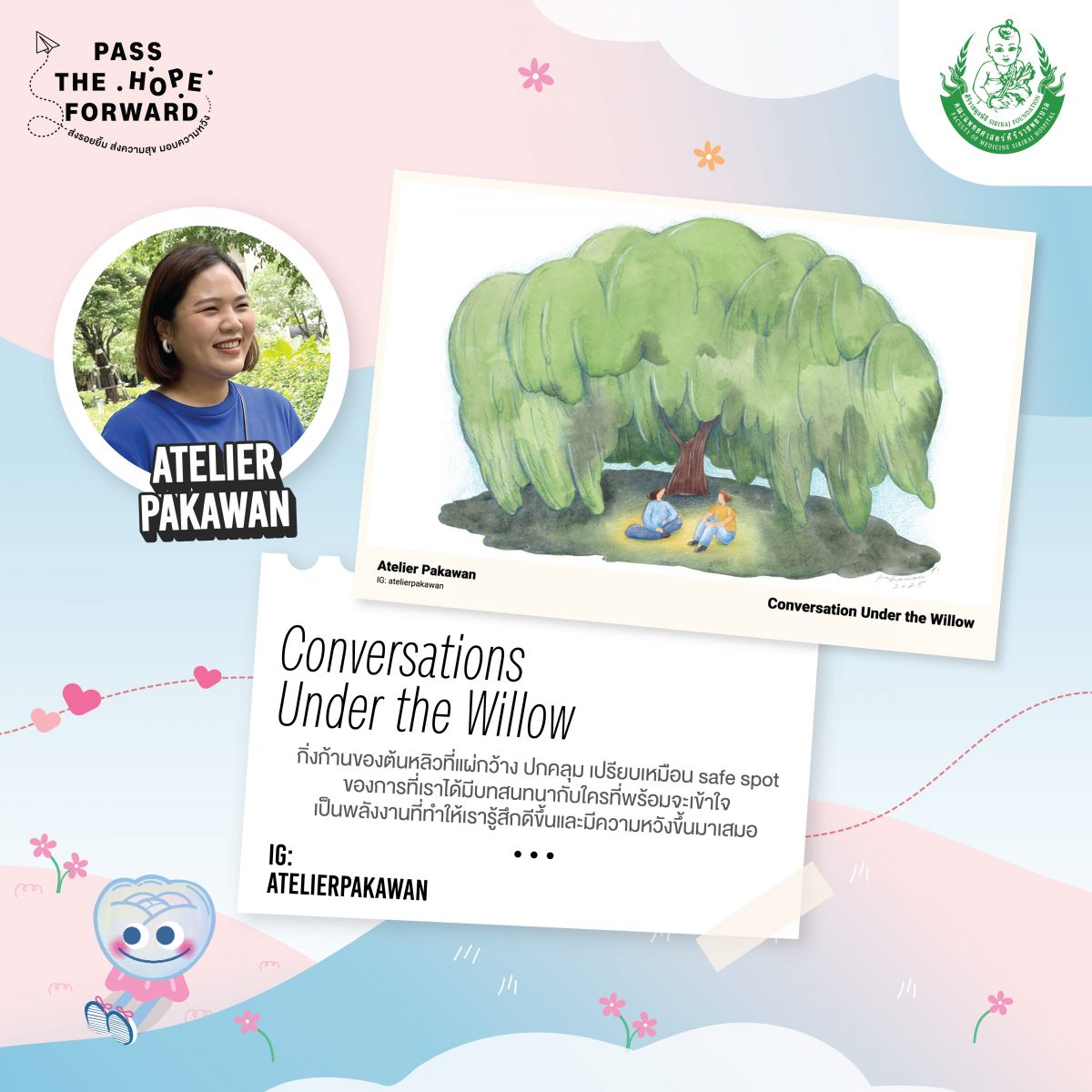 ร่วมส่งรอยยิ้ม ส่งความสุข มอบความหวัง #PassTheHopeForward ผ่านโปสการ์ดชุด Postcard Set 3 – Hope You’re Doing Well ในราคา 100 บาท *ไม่สามารถนำไปลดหย่อนภาษีได้ โดยรายได้ทั้งหมดหลังหักค่าใช้จ่ายจะนำไปสมทบกองทุนห้องผ่าตัดศิริราช ชั้น 3-5 ตึกสยามินทร์ โรงพยาบาลศิริราช เริ่มจำหน่ายตั้งแต่ วันนี้เป็นต้นไป ผ่านช่องทาง LINE OA : @PPUNSE หรือ https://lin.ee/MEovwwP