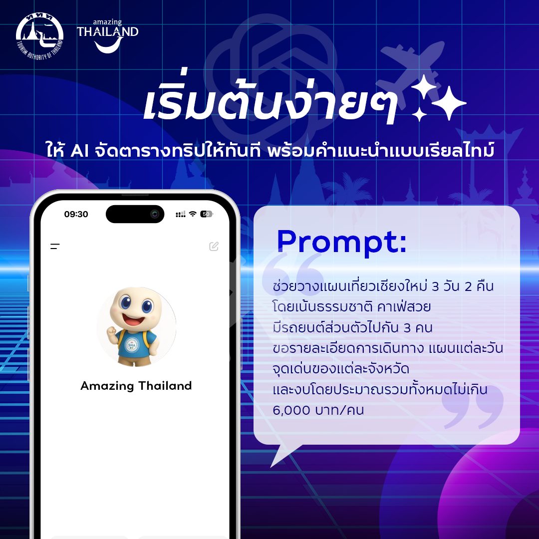 มาร่วมสัมผัสประสบการณ์จริงของการใช้งาน AI Travel Assistant โดย ททท. เปิดโอกาสให้นักท่องเที่ยวที่สนใจสามารถทดลองใช้ Plug-in “Amazing Thailand” ซึ่งจะทำหน้าที่เสมือนไกด์ส่วนตัว คอยแนะนำเส้นทางการท่องเที่ยว ข้อมูลที่พัก ร้านอาหาร กิจกรรมท้องถิ่น ตลอดจนเทศกาลสำคัญได้แบบเรียลไทม์และตรงตามความสนใจของแต่ละบุคคล โดยสามารถทดลองใช้งานได้แล้วที่ https://chatgpt.com/g/g-686679c040e88191b1ba1e18989d3d2e-amazing-thailand