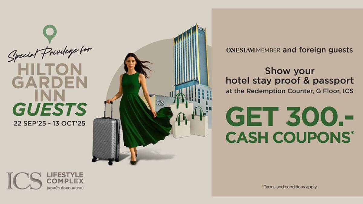โดย ICS Lifestyle Complex มอบความพิเศษให้กับสมาชิก ONESIAM ที่เข้าพักในโรงแรม Hilton Garden Inn Bangkok Riverside เพียงแสดงหลักฐานการเข้าพัก พร้อมบัตรประชาชนหรือพาสปอร์ต ณ จุดแลกของสมนาคุณ ชั้น G ICS Lifestyle Complex สามารถแลกรับทันที คูปองส่วนลดแทนเงินสดมูลค่า 300 บาท (มูลค่าใบละ 100 บาท สำหรับใช้ ณ ร้านค้าภายในไอซีเอสที่ร่วมรายการ ขั้นต่ำ 300.- ขึ้นไป, จำนวนรวม 3 ใบ) จำกัด 1 สิทธิ์ / ท่าน / วัน / การจองห้องพัก และจำกัดการแลกรับสูงสุด 2 สิทธิ์ / ท่าน ) สำหรับใช้เป็นส่วนลดในร้านค้าที่ร่วมรายการ รวมกว่า 40 ร้านค้า และแบรนด์ชั้นนำ ครบครันทุกไลฟ์สไตล์ ทั้งร้านอาหารชื่อดัง