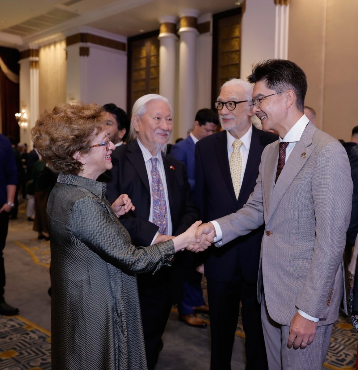 โดยในงานมีเอกอัครราชทูตร่วมยินดีมากมาย อาทิ โรเบิร์ต เอฟ. โกเดค เอกอัครราชทูตสหรัฐอมริกา เปาโล ดีโอนีซี เอกอัครราชทูตอิตาลี เยฟกินี โทมิคิน เอกอัครราชทูตรัสเซีย นาเกศ ซิงห์ เอกอัครราชทูตอินเดีย ดานิเอล เอมิลิโอ เมนโดซา เลอัล เอกอัครราชทูตโคลอมเบีย เปโดร ปาโบล ซาน ฮอร์เฮ โรดริเกซ เอกอัครราชทูตคิวบา ซีเร่ย์ เดนนิเซ อากิลาร์ เอกอัครราชทูตกัวเตมาลา ร่วมด้วยผู้แทนกระทรวงต่างประเทศ สมาชิกกงสุลกิตติมศักดิ์ อาทิ ณพ ณรงค์เดช กงสุลฯเม็กซิโก ม.ล.ปรียาพรรณ ศรีธวัช กงสุลใหญ่ฯ เปรู เชียงใหม่ จักร จามิกรณ์ กงสุลใหญ่ฯ นิการากัว ปณิธิ วสุรัตน์ กงสุลฯไซปรัส