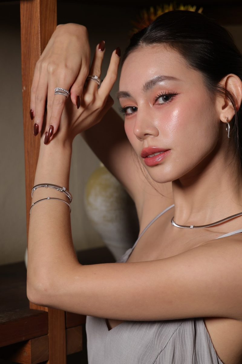 ต่างหู และแหวน สี White Gold จากคอลเลกชัน Masai ทำให้ลุคนี้มีมิติ และสะท้อนความงดงามเหนือกาลเวลาตามแบบฉบับของแบรนด์