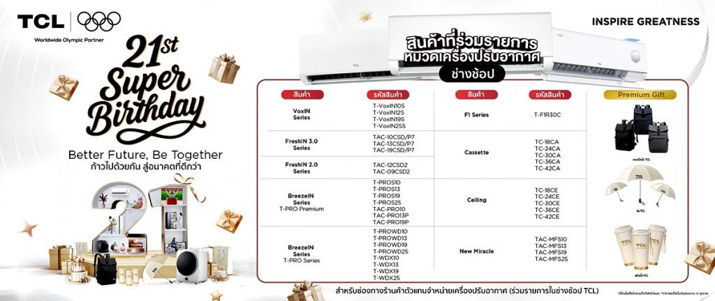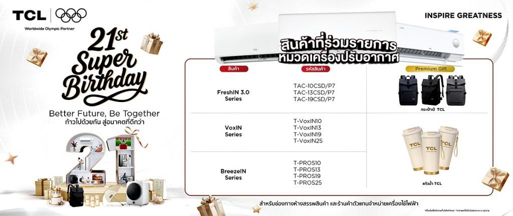 TCL จัดงานฉลองครบรอบ 21 ปี สุดปัง เปิดแคมเปญ 21st Super Birthday | Better Future, Be Together ก้าวไปด้วยกัน สู่อนาคตที่ดีกว่า คืนกำไรลูกค้าครั้งใหญ่ แจกของขวัญมูลค่ารวมกว่า 6,000,000 บาท ช้อปปั๊บ รับเลย เริ่มตั้งแต่วันที่ 25 ต.ค. 68 – 31 ม.ค. 69 พิเศษ ซื้อ Mini LED TV รับฟรีเครื่องอบผ้า Mini Dryer มูลค่า 5,990 บาททันที พร้อมกิจกรรม Super Star Content สุดยอด Content Creator ตัวจริงชิงรางวัลรวม 42 รางวัล มูลค่ารวมกว่า 480,000 บาท ตั้งแต่วันที่ 1 พ.ย. 2568 – 5 ม.ค. 2569 พร้อมเปิดตัว “Super Start Up” เฟ้นหา 21 ผู้ประกอบการรุ่นใหม่ ร่วมสร้างอนาคตที่ดีกว่า