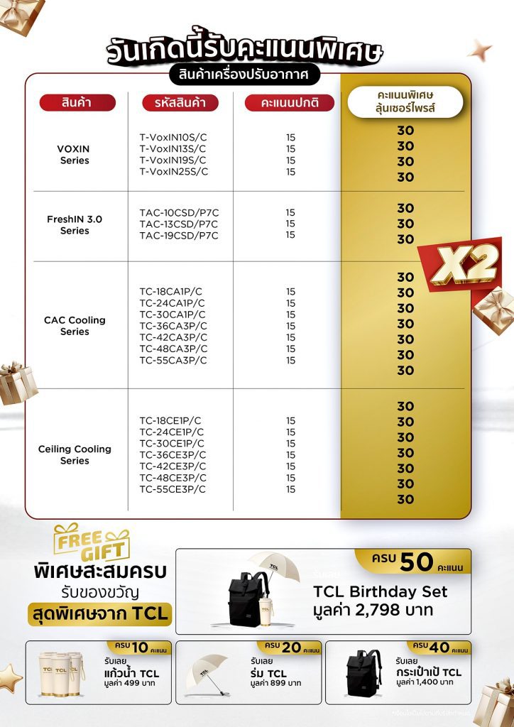 พิเศษสำหรับกลุ่มช่างติดตั้งเครื่องปรับอากาศ กับกิจกรรม “ช่างช้อป TCL วันเกิดนี้ ลุ้นเซอร์ไพรส์” เพียงซื้อเครื่องปรับอากาศ TCL รุ่นที่ร่วมรายการ รับคะแนนพิเศษ X2 (สองเท่า) เพื่อสะสมและแลกรับของขวัญสุดพิเศษจาก TCL ตั้งแต่วันที่ 25 ต.ค. 68 – 31 ธ.ค. 68