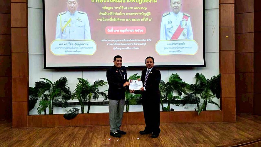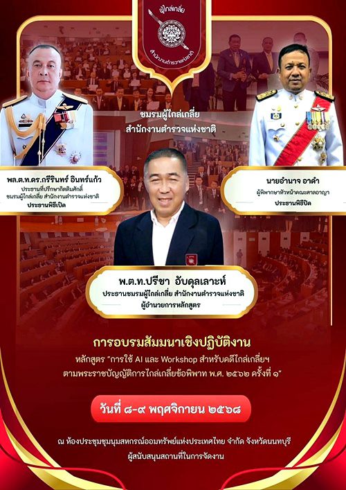 วันที่ 8–9 พฤศจิกายน 2568 ชมรมผู้ไกล่เกลี่ย สำนักงานตำรวจแห่งชาติ นำโดย พ.ต.ท.ปรีชา อับดุลเลาห์ ประธานชมรมฯ พร้อมด้วยคณะกรรมการชมรมฯ จัดโครงการอบรมเชิงปฏิบัติการ “การประยุกต์ใช้ปัญญาประดิษฐ์ (AI) และ Workshop สำหรับการไกล่เกลี่ยข้อพิพาท” ตามพระราชบัญญัติไกล่เกลี่ยข้อพิพาท พ.ศ. 2562
