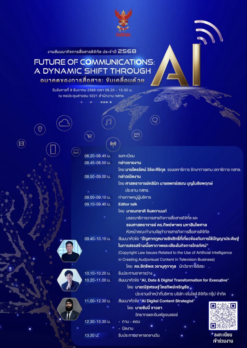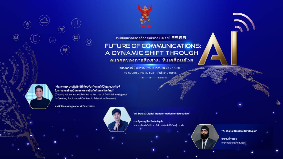 สำนักงาน กสทช. กำหนดจัดงานสัมมนากิจการสื่อสารดิจิทัล กสทช. ประจำปี 2568 ภายใต้แนวคิด “Future of Communications: a dynamic shift through AI” (อนาคตของการสื่อสาร: ขับเคลื่อนด้วย AI) ในวันอังคารที่ 9 ธันวาคม 2568 เวลา 08.20 – 13.30 น. ณ หอประชุมสายลม 5021 (อาคารหอประชุมชั้น 2) สำนักงาน กสทช. โดยมุ่งแลกเปลี่ยนองค์ความรู้และแนวทางการพัฒนากิจการสื่อสารของประเทศไทยในยุคที่เทคโนโลยีปัญญาประดิษฐ์ (AI) เข้ามามีบทบาทสำคัญ