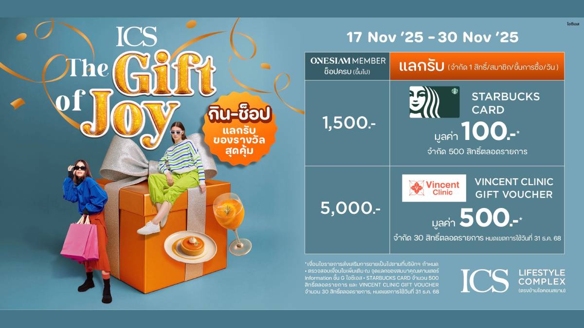“ICS THE GIFT OF JOY” มอบสิทธิพิเศษให้กับลูกค้าไอซีเอสที่เป็นสมาชิก ONESIAM โดยเฉพาะ เพียงซื้อสินค้าและใช้บริการ ณ ร้านค้า ร้านอาหาร ตลอดจนบริการต่าง ๆ ภายในไอซีเอสที่ร่วมรายการ ครบตามเงื่อนไขที่กำหนด (ไม่รวมยอดใช้จ่ายผ่านออนไลน์) ก็แลกรับของรางวัลสุดคุ้มได้ทันที โดยสมาชิก ONESIAM ที่รวบรวมใบเสร็จครบ 1,500 บาทขึ้นไป แลกรับฟรี STARBUCKS CARD มูลค่า 100 บาท (จำกัด 500 สิทธิ์ตลอดรายการ) และหากรวบรวมใบเสร็จตั้งแต่ 5,000 บาทขึ้นไป แลกรับฟรี VINCENT CLINIC GIFT VOUCHER มูลค่า 500 บาท (จำกัด 30 สิทธิ์ตลอดรายการ) สามารถแลกรับรางวัลได้ที่จุดแลกของสมนาคุณ เคาน์เตอร์ Information ชั้น G ICS Lifestyle Complex โดยจำกัด 1 สิทธิ์ / สมาชิก / ขั้นการซื้อ / วัน
