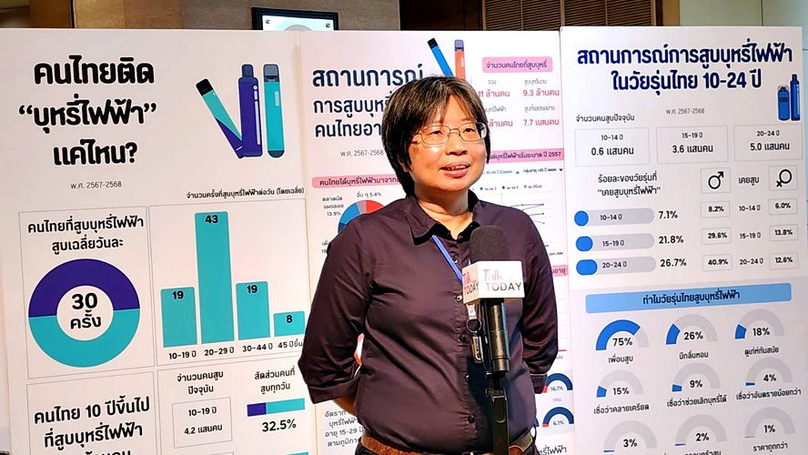 รศ.พญ.เริงฤดี ปธานวนิช ภาควิชาเวชศาสตร์ชุมชน คณะแพทยศาสตร์โรงพยาบาลรามาธิบดี และหัวหน้าโครงการสำรวจสุขภาพประชาชนไทยโดยการตรวจร่างกายครั้งที่ 7 พ.ศ. 2567-2568 นำเสนอผลสำรวจสถานการณ์บุหรี่ไฟฟ้า ว่า ปัจจุบันคนไทยอายุ 10 ปีขึ้นไปสูบบุหรี่ไฟฟ้าจำนวน 1.7 ล้านคน เพิ่มขึ้นกว่า 1 ล้านคนจากการสำรวจเมื่อ 5 ปีที่แล้ว ในจำนวนคนที่ปัจจุบันสูบบุหรี่ไฟฟ้า 73% เป็นคนอายุต่ำกว่า 30 ปี และที่น่าเป็นห่วงคือ มีเด็กตั้งแต่ระดับชั้นประถมศึกษา-มัธยมศึกษา หรืออายุ 10-19 ปี สูบบุหรี่ไฟฟ้ากว่า 400,000 คน โดย 51% เพิ่งเริ่มสูบในช่วง 1 ปีที่ผ่านมา