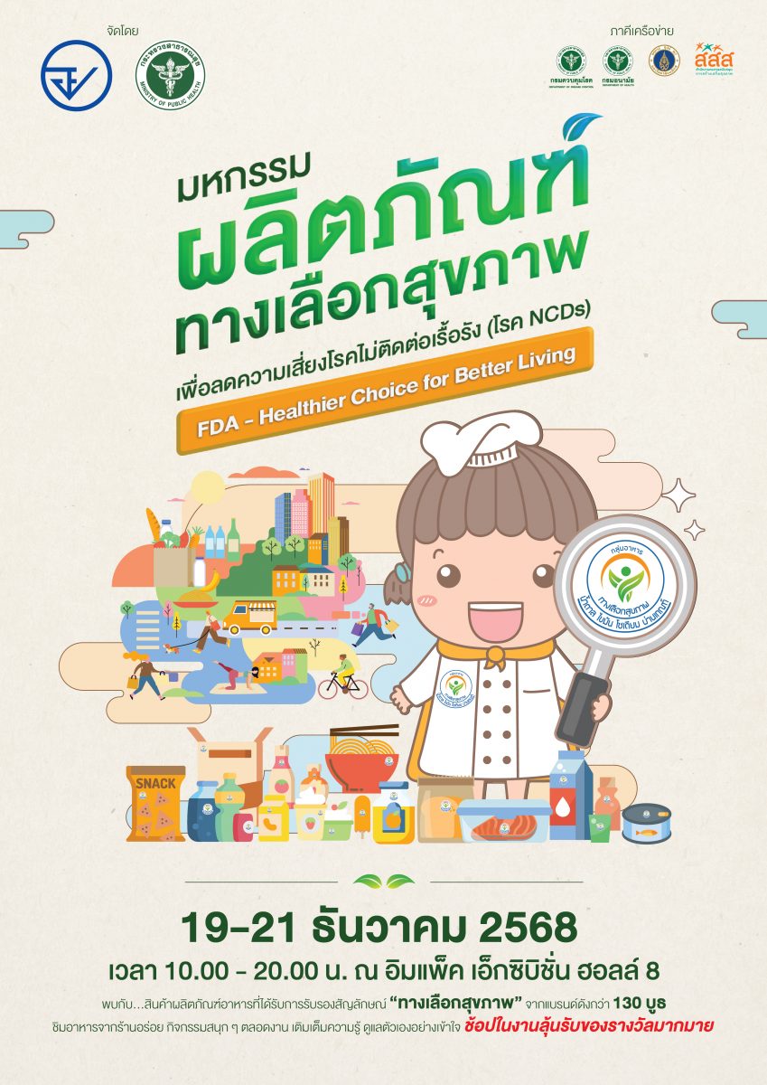 งานมหกรรมผลิตภัณฑ์ทางเลือกสุขภาพ (Healthier Choice Expo) ที่ อย. ตั้งใจจัดขึ้นในระหว่างวันที่ 19-21 ธันวาคม 2568 ณ อิมแพ็ค เอ็กซิบิชั่น ฮอลล์ 8 เมืองทองธานี เพื่อให้ประชาชนเข้าถึงข้อมูลสุขภาพที่ถูกต้อง และเลือกซื้อผลิตภัณฑ์อาหารที่ดีต่อสุขภาพได้ง่ายขึ้น ผ่านสัญลักษณ์โภชนาการ ‘ทางเลือกสุขภาพ’ ซึ่งเป็นตัวช่วยสำคัญในการตัดสินใจเลือกผลิตภัณฑ์ที่ผ่านการตรวจสอบแล้วว่า มีปริมาณน้ำตาล ไขมัน และโซเดียม อยู่ในเกณฑ์ที่เหมาะสม งานนี้จึงเป็นอีกก้าวหนึ่งในการร่วมกันสร้างสังคมไทยที่แข็งแรง ลดความเสี่ยงการเกิดโรค NCDs และยกระดับคุณภาพชีวิตของประชาชน