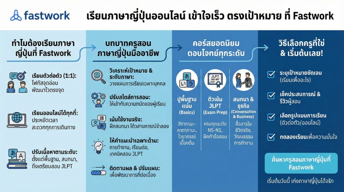 Fastwork คือแพลตฟอร์มออนไลน์ที่รวบรวมบริการเรียนพิเศษครบทุกวิชา รวมถึงครูสอนภาษาญี่ปุ่นคุณภาพสูงที่คุณสามารถเลือกได้ตามสไตล์และเป้าหมายการเรียนของตัวเอง ไม่ว่าคุณจะสนใจ เรียนภาษาญี่ปุ่นตัวต่อตัว, เรียนภาษาญี่ปุ่นออนไลน์, หรือรับสอนภาษาญี่ปุ่นเฉพาะทาง ก็สามารถค้นหาผู้สอนที่เหมาะกับระดับและความต้องการของคุณได้ง่าย ๆ