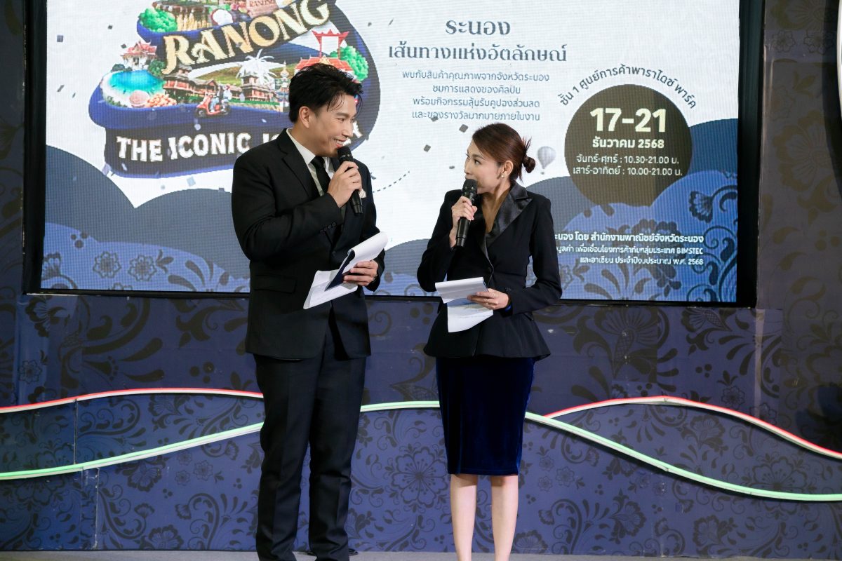 จังหวัดระนอง โดย สำนักงานพาณิชย์จังหวัดระนอง เดินหน้าขยายผลความสำเร็จโครงการพัฒนาเศรษฐกิจสร้างมูลค่าเพื่อเชื่อมโยงการค้ากับกลุ่มประเทศ BIMSTEC และอาเซียน ประจำปีงบประมาณ พ.ศ. 2568 จัดงานแสดงและจำหน่ายสินค้าอัตลักษณ์และบริการท่องเที่ยวของจังหวัดระนอง พร้อมกิจกรรมเจรจาธุรกิจการค้า (Business Matching) ภายใต้ชื่องาน Ranong The Iconic Journey “ระนองเส้นทางแห่งอัตลักษณ์” ระหว่างวันที่ 17-21 ธันวาคม ณ ลาน Royal Park ชั้น 1 ศูนย์การค้าพาราไดซ์ พาร์ค กรุงเทพมหานคร
