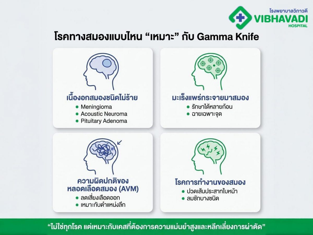 Gamma Knife ไม่ได้ใช้รักษาแค่โรคใดโรคหนึ่งเท่านั้น แต่ครอบคลุมโรคทางสมองและระบบประสาทหลายกลุ่ม โดยเฉพาะโรคที่ต้องการ ความแม่นยำสูง และต้องการหลีกเลี่ยงการผ่าตัดเปิดกะโหลก เพื่อให้เข้าใจง่าย สามารถแบ่งกลุ่มโรคที่เหมาะกับการรักษาด้วย Gamma Knife ได้เป็น 4 กลุ่มหลักดังนี้
