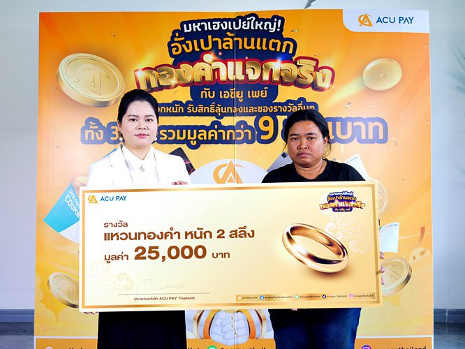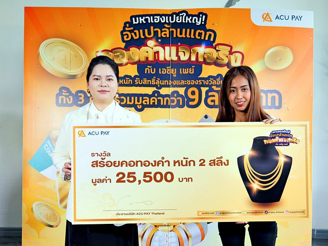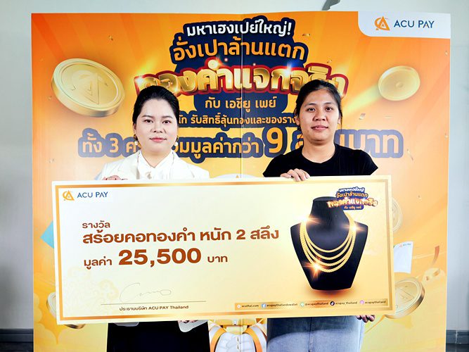 บริษัท เอซียู เพย์ (ไทยแลนด์) จำกัด จัดพิธีมอบรางวัลแก่ผู้โชคดีจากแคมเปญ “มหาเฮงเปย์ใหญ่! อั่งเปาล้านแตก ทองคำแจกจริง กับ ACU PAY ครั้งที่ 2” ซึ่งได้จับรางวัลกันไป เมื่อวันจันทร์ที่ 8 ธันวาคม 2568 ที่ผ่านมา สำหรับผู้โชคดี ในครั้งนี้ มีทั้งหมด 3 ท่าน ที่เดินทางมารับรางวัลด้วยตนเอง ที่บริษัท เอซียู เพย์ (ไทยแลนด์) จำกัด เมื่อวันที่ 19 ธันวาคม 2568 ในพิธีดังกล่าวได้รับเกียรติจากผู้บริหารระดับสูงของบริษัท มอบรางวัลให้แก่ผู้โชคดี โดย คุณหยาง หยวนหยวน ประธานบริษัท เอซียู เพย์ (ไทยแลนด์) จำกัด มอบรางวัล สร้อยคอทองคำ หนัก 2 สลึง มูลค่ารางวัลละ 25,500 บาท จำนวน 2 รางวัล รวมมูลค่า 51,000 บาท ให้กับผู้โชคดี ได้แก่ คุณสุวนันท์ มาบัง และ คุณจุฑามาศ อุดมธรรม และ มอบรางวัล แหวนทองคำ หนัก 2 สลึง จำนวน 1 รางวัล รวมมูลค่า 25,000 บาท ให้กับผู้โชคดี ได้แก่ คุณสมพร คูณงูเหลือม