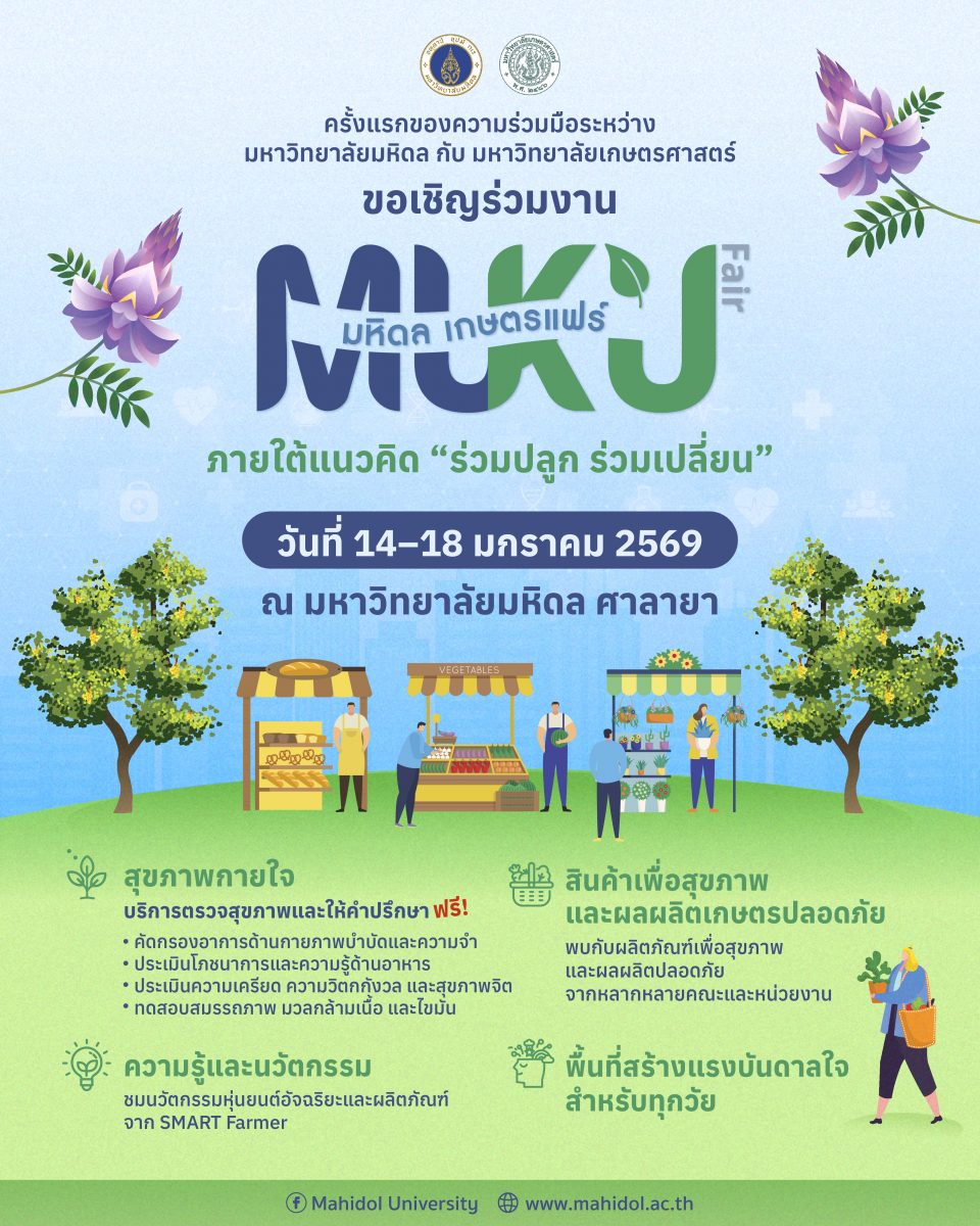 ขอเชิญชวนประชาชนร่วมเป็นส่วนหนึ่งของพลังการเปลี่ยนแปลง “ร่วมปลูก” องค์ความรู้ และ “ร่วมเปลี่ยน” อนาคตไปด้วยกัน ในงาน “มหิดล – เกษตรแฟร์ 2569” ระหว่างวันที่ 14-18 มกราคม 2569 ณ มหาวิทยาลัยมหิดล ศาลายา