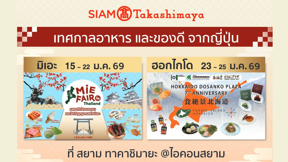 สยาม ทาคาชิมายะ ห้างสรรพสินค้าญี่ปุ่นขนานแท้แห่งเดียวในประเทศไทย ณ ไอคอนสยาม ตอกย้ำความเป็นผู้นำด้านวัฒนธรรมและไลฟ์สไตล์ญี่ปุ่นด้วยการเนรมิตพื้นที่ชั้น G ให้เป็นสวรรค์ของเหล่านักชิม โดยการร่วมมือกับรัฐบาลจังหวัดของญี่ปุ่นจัดสองอีเวนต์ใหญ่ต้อนรับต้นปีที่รวบรวมสุดยอดวัตถุดิบพรีเมียมและเมนูหาทานยากจากสองพื้นที่ที่มีเอกลักษณ์โดดเด่นอย่างจังหวัด “มิเอะ” (Mie) และภูมิภาค “ฮอกไกโด” (Hokkaido) มาเสิร์ฟให้คนไทยได้สัมผัสแบบไม่ต้องบินไปไกลถึงญี่ปุ่น เริ่มต้นศักราชใหม่ด้วยการเดินทางผ่านรสชาติและวัฒนธรรมที่จะสร้างความประทับใจให้แก่ผู้มาเยือนตลอดช่วงเดือนมกราคมนี้