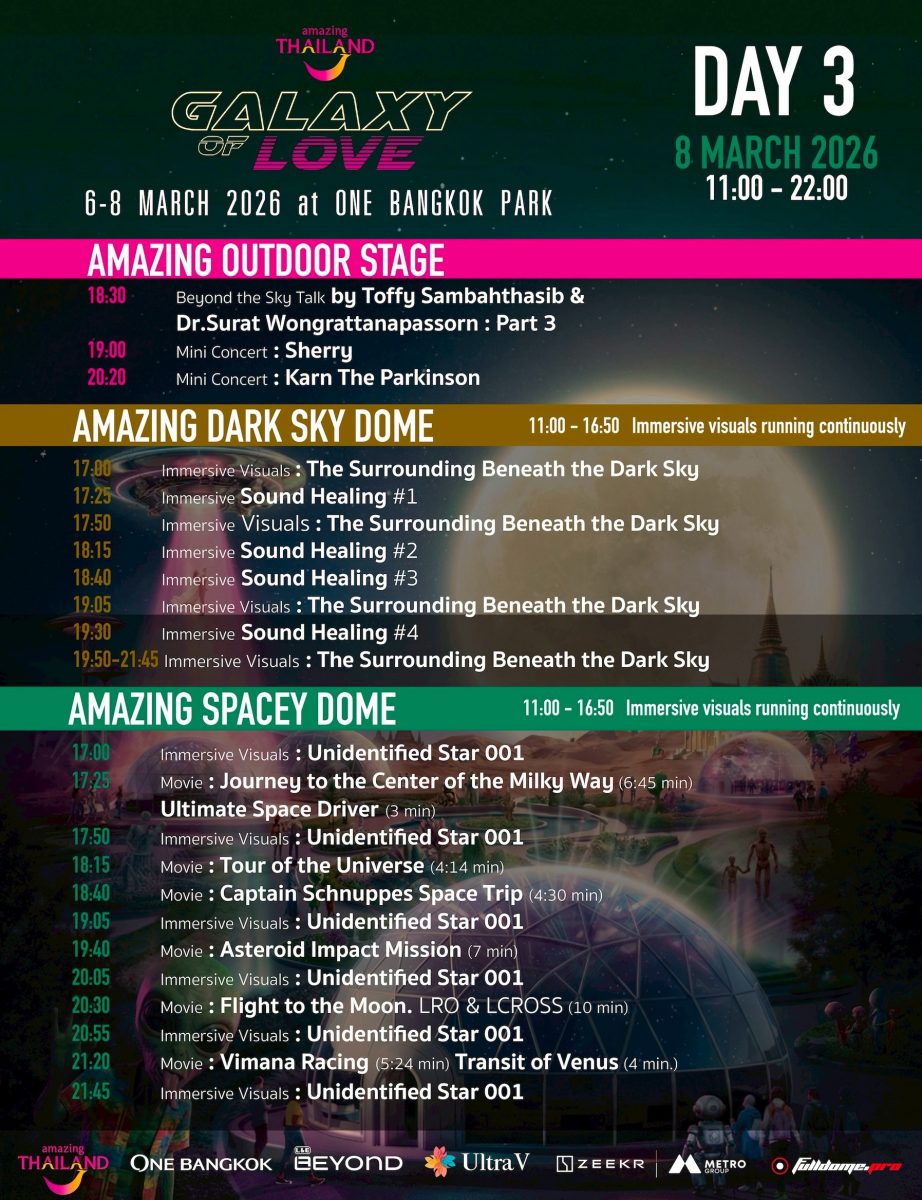 พบกับ Immersive Dome ขนาดยักษ์ 2 โดม พร้อมทีมงานจากสหรัฐอเมริกา และกิจกรรมที่จะเยียวยา เปิดมุมมอง และสร้างแรงบันดาลใจให้คุณตลอด 3 วันเต็ม: