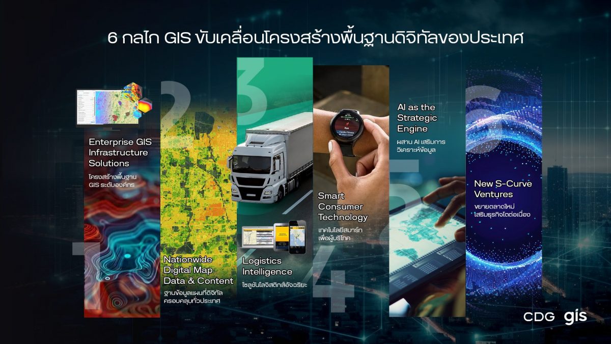 • GIS Driver 6: New S Curve Ventures: ขับเคลื่อนการเติบโตระยะยาวด้วยการต่อยอดความเชี่ยวชาญด้านเทคโนโลยี GIS สู่ตลาดต่างประเทศ พร้อมขยายบทบาทสู่การเป็นพันธมิตรทางเทคโนโลยีในระดับสากล ควบคู่กับการสำรวจและพัฒนาธุรกิจใหม่ที่ต่อยอดจากศักยภาพของ GIS เพื่อสร้างโอกาสทางธุรกิจใหม่และเสริมขีดความสามารถขององค์กรในอนาคต