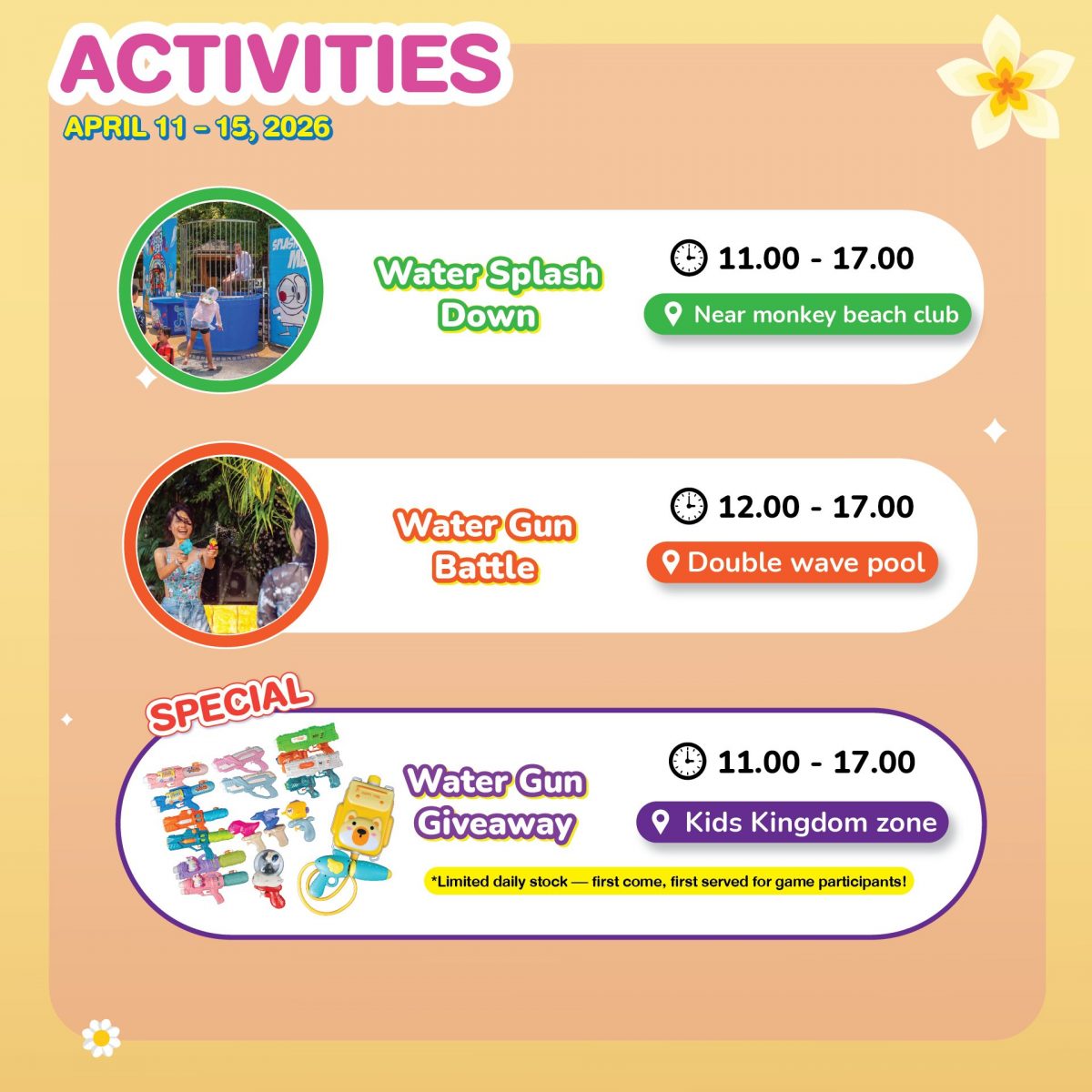 • สนุกสนานได้ทั้งวัน กับกิจกรรม Splash Activities ไม่ว่าจะเป็น Water Splash Down ที่โซนใกล้กับ Monkey Beach Club, Water Gun Battle ที่โซน Double Wave และ Water Gun Giveaway ที่โซน Kids Kingdom (จำนวนจำกัด แบบมาก่อนได้ก่อน)