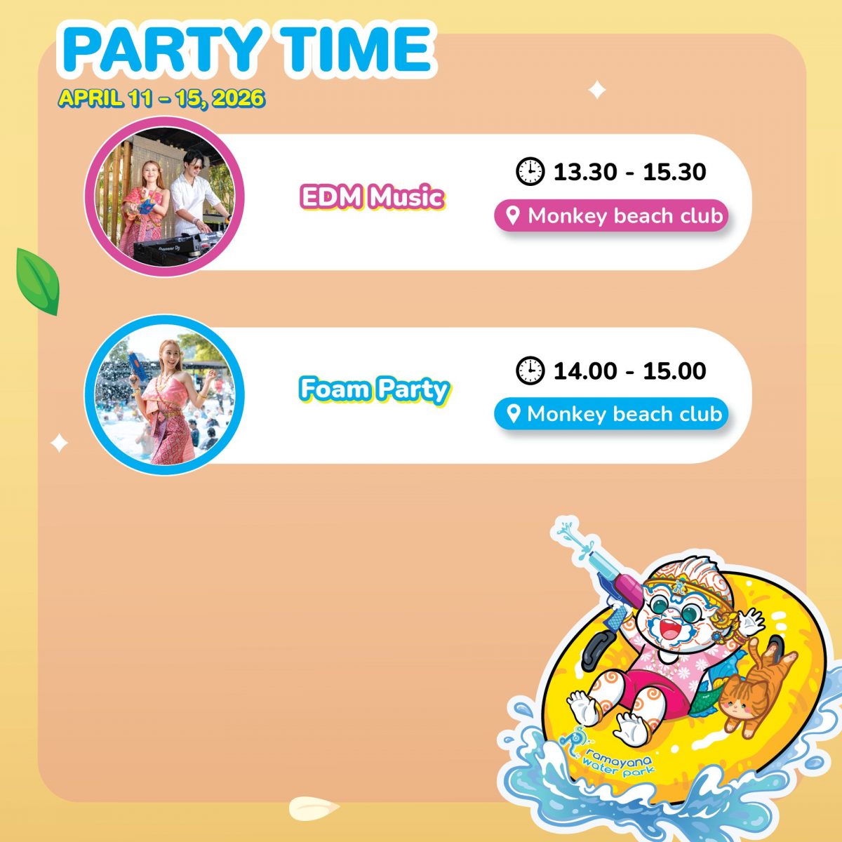 เทศกาลสงกรานต์ปีนี้ชวนทุกคนยกแก๊งทั้งครอบครัวและเพื่อน ๆ มาสัมผัสประสบการณ์คลายร้อนสุดยิ่งใหญ่ที่ สวนน้ำรามายณะ พัทยา สนุกครบทั้งสวนน้ำและความบันเทิงแบบจัดเต็ม พร้อมต่อเนื่องความพิเศษกับการเฉลิมฉลองครบรอบ 10 ปี ที่เตรียมขนกิจกรรมและมินิคอนเสิร์ตสุดเอ็กซ์คลูซีฟมาเซอร์ไพรส์ตลอดเดือนพฤษภาคมนี้อีกด้วย สวนน้ำเปิดให้บริการเวลา 11.00 – 18.00 น. (ปิดทุกวันพุธ) และพิเศษ! วันที่ 15 เมษายน 2569 เปิดให้บริการตามปกติ สามารถจองบัตรล่วงหน้าได้ที่ https://ramayanawp.com/4j1SZet พร้อมติดตามรายละเอียดกิจกรรมและโปรโมชันเพิ่มเติมได้ทาง Facebook: Ramayana Water Park Thailand และ www.ramayanawaterpark.com หรือสอบถามข้อมูล โทร. 033-005-929 แล้วมาสร้างโมเมนต์ความสุขครั้งพิเศษไปด้วยกันในเทศกาลแห่งการเฉลิมฉลองนี้!