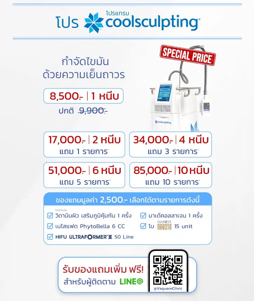 สำหรับคนที่สนใจอยากทำ Coolsculpting มีโปรโมชัน Coolsculpting ราคาของ V Square Clinic มาแนะนำบอกต่อค่ะ