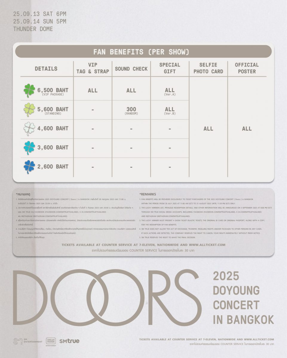 หลังประตูบานนี้ เสียงร้องของ DOYOUNG (โดยอง) จะเล่าเรื่องราวผ่านหลากหลายอารมณ์สุดลึกซึ้ง เพื่อเชื่อมโยงหัวใจของผู้ชมให้โบยบินไปหาความทรงจำอันมีค่าด้วยกัน ในคอนเสิร์ตเดี่ยวเต็มรูปแบบ ‘2025 DOYOUNG CONCERT [ Doors ] in BANGKOK’ เปิดจำหน่ายบัตรรอบสมาชิก “NCTzen 127” Membership (GL) Pre-Sale ในวันเสาร์ที่ 26 กรกฎาคม 2025 เวลา 11:00 น. – 16:59 น. ทางเว็บไซต์เท่านั้น และรอบบุคคลทั่วไป (General Sale) ในวันอาทิตย์ที่ 27 กรกฎาคม 2025 ตั้งแต่เวลา 11:00 น. เป็นต้นไป ทางเคาน์เตอร์เซอร์วิสในร้าน 7-Eleven ทุกสาขาทั่วประเทศ และทางเว็บไซต์