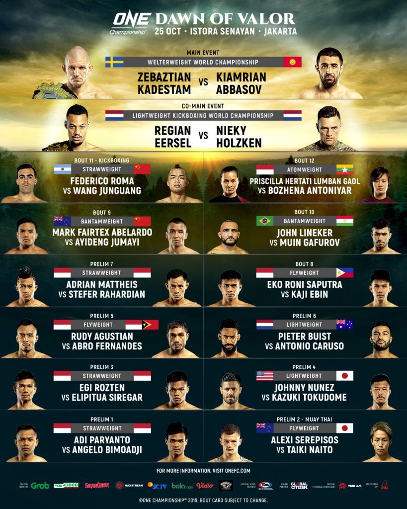 การแข่งขัน ONE Championship ศึก ONE: DAWN OF VALOR วันศุกร์นี้ ที่อินโดนีเซีย เดือดแน่นอน ด้วยไฟต์ล่าบัลลังก์-ล้างแค้น เดิมพันเข็มขัดสองเส้น