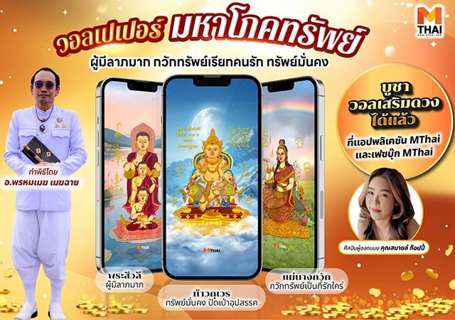 เปิดบูชาแล้ว วอลเปเปอร์เสริมดวง 2568 ชุด “มหาโภคทรัพย์” มีถึง 3 ลายให้เลือก ทั้งพระสีวลี, ท้าวกุเวร และแม่นางกวักที่แอปพลิเคชัน MThai และเฟซบุ๊ก MThai ในราคาเพียง 189 บาท